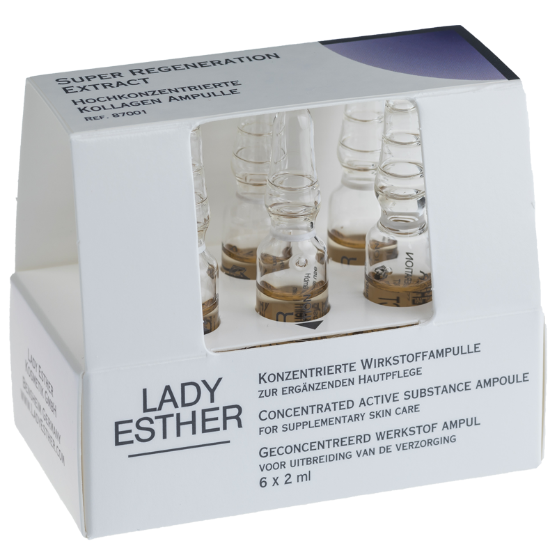 Super Regeneration Extract is a proven active intensive treatment with highly concentrated collapur for improving and restoring the resilience and elasticity of the skin. The texture of the epidermis, creases and wrinkles are smoothened out and the binding power for the skin’s moisture is improved.  As a result Super Regeneration Extract counteracts the formation of wrinkles.